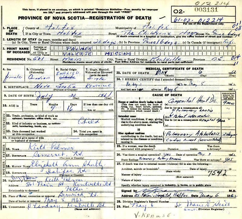 Parents Father: PALMER, Keith Calkin Mother: SHULTZ, Elizabeth Ann Birth Born on July 20, 1961 in Kentville, Kings Co., NS Death Died on May 05, 1962 in Halifax, Halifax Regional Municipality, NS Buried in Berwick Cemetery in Berwick, Kings Co., NS Notes Death: Congenital Heart Disease Sources Nova Scotia Deaths: Year 1962 Pg. 3131 Images Miles & Frances (Calkin) & Steven & Valerie Palmer Valerie Palmer Death