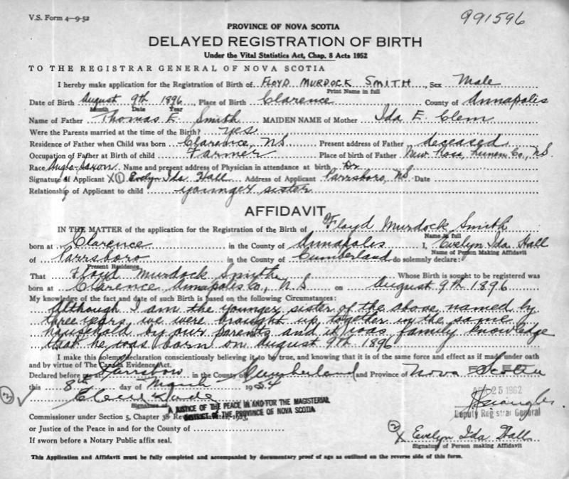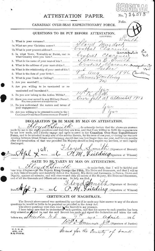 Parents Father: SMITH, Thomas Ephraim Mother: CLEMM, Ida Eugenia Birth Born on August 09, 1896 in Clarence, Annapolis Co., NS Death Died on May 14, 1990 Buried in Fairview Cemetery in Lawrencetown, Annapolis Co., NS Marriages PALMER, Ruby Gertrude Married on May 09, 1923 in Weston, Kings Co., NS Children SMITH, Allison Palmer: June 20, 1924 - July 12, 1959 SMITH, Ronald Eugene: August 25, 1925 - April 14, 1945 Notes Occupation: Farmer Military Service: WW1 CEF Captain Sources Findagrave.com: https://www.findagrave.com/memorial/209377375/floyd-murdoch-smith Images Floyd & Ruby (Palmer) Smith & Allison & Marie (Gillis) Smith Floyd Smith Floyd Smith Death Ruby Palmer Marriage Floyd Smith WW1 Attestion1 Floyd Smith WW1 Attestion