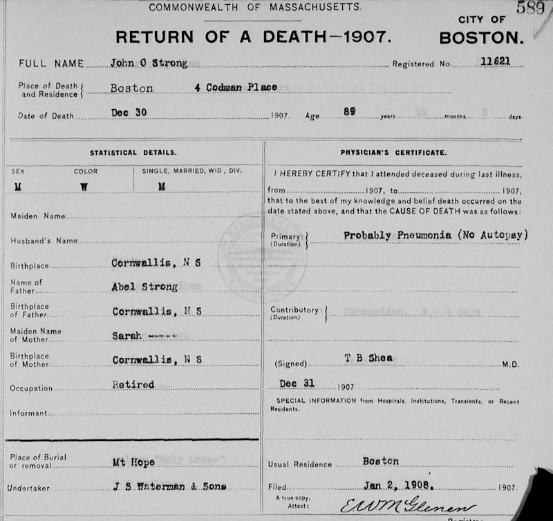 Birth Born on 1818 in Cornwallis, Kings Co., NS Death Died on December 30, 1907 in Boston, Suffolk Co., MA Marriages NICHOLS, Sarah Married on February 16, 1858 in Kings Co., NS Notes Occupation: Carpenter Sources Massachusetts Deaths: Boston Pg. 589 #11621 Images John Strong Death