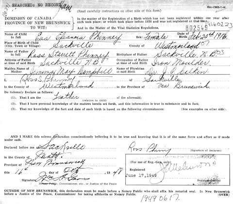 Parents Father: PHINNEY, Ross Starrett Mother: CAMPBELL, Jemima May Birth Born on February 23, 1916 in Sackville, Westmorland Co., NB Marriages BROWN, Earl William Married on January 26, 1945 in Moncton, Westmorland Co., NB Notes Occupation: Telephone Operator Images Eva Phinney Birth Eva Phinney Marriage