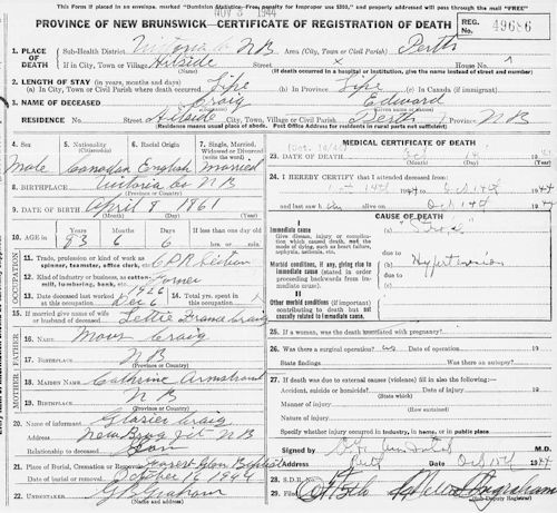 Parents Father: CRAIG, Moses Mother: ARMSTRONG, Catherine H. Birth Born on April 08, 1862 in Perth, Victoria Co., NB Death Died on October 14, 1944 in Hillside, Victoria Co., NB Buried in Forest Glen Baptist Cemetery in Tobique, Victoria Co., NB Marriages LOVELY, Frances Letitia Children CRAIG, Arthur Parnell: December 06, 1891 CRAIG, Herbert: February 12, 1893 - 1914 CRAIG, Glasier Mirl: April 04, 1895 - 1978 CRAIG, Alma K.: November 15, 1897 CRAIG, Harry Donohue: February 17, 1900 CRAIG, John Stratton: April 07, 1902 - September 24, 1986 Notes Occupation: Section Man - Canadian Pacific Railroad Death: Stroke Sources NB Deaths: #49686 Images Edward Craig Death