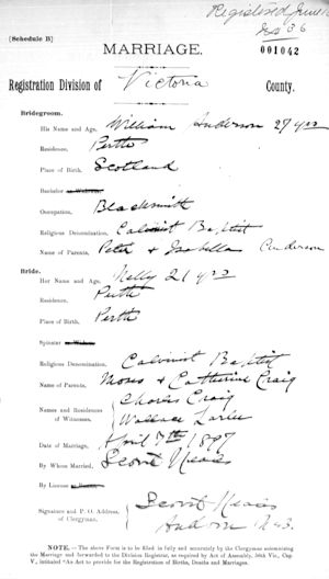Parents Father: CRAIG, Moses Mother: ARMSTRONG, Catherine H. Birth Born on February 11, 1877 in Perth, Victoria Co., NB Death Died on January 09, 1940 in Plaster Rock, Victoria Co., NB Buried in Larlee Creek Cemetery in Perth, Victoria Co., NB Marriages ANDERSON, William Shepard Married on April 07, 1897 in Perth, Victoria Co., NB Children ANDERSON, Girl: May 09, 1897 - 1897 ANDERSON, Ronald Craig: May 01, 1898 - October 05, 1978 ANDERSON, Beulah Isobel: August 05, 1900 - 1925 ANDERSON, Sherry Shepard: July 30, 1903 ANDERSON, Alfred William: July 10, 1905 ANDERSON, Maurice Talmadge: December 02, 1908 ANDERSON, James Burton: September 30, 1911 - June 25, 1992 ANDERSON, John McNair: January 31, 1916 - 1979 Notes Occupation: Coronary Thrombosis Sources NB Deaths: #25381 Images Nellie (Craig) Anderson Death Nellie Craig Marriage