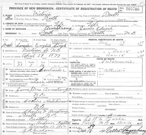 Parents Father: ARMSTRONG, James VanNamee Mother: HUTCHINSON, Caroline Amelia Birth Born on April 29, 1877 in Perth, Victoria Co., NB Death Died on December 15, 1950 in Perth, Victoria Co., NB Buried in United Baptist Cemetery in Andover, Victoria Co., NB Notes Occupation: Contractor Death: Endocarditis Sources NB Deaths: #5706 Images James E. Armstrong Birth James E. Armstrong Death