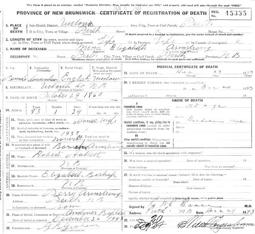 Parents Father: HALLETT, Robert Mother: BISHOP, Elizabeth H. Birth Born on October 29, 1860 in Perth, Victoria Co., NB Death Died on December 23, 1943 in Perth, Victoria Co., NB Buried in United Baptist Cemetery in Andover, Victoria Co., NB Marriages ARMSTRONG, Barnabas Children ARMSTRONG, Bertha E.: 1878 - 1936 ARMSTRONG, Ida May: January 22, 1880 - December 29, 1962 ARMSTRONG, William: 1880 ARMSTRONG, John Perry: February 09, 1881 - December 23, 1955 ARMSTRONG, Ethel Leulla: March 29, 1883 - January 05, 1960 ARMSTRONG, Marion Louise: May 29, 1887 - September 12, 1960 Sources NB Deaths: #45335 Vol: 156 Images Mina Hallett Birth Barnabas & Mina (Hallett) Armstrong Mina (Hallett) Armstrong Death