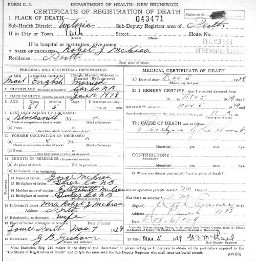 Birth Born on June 12, 1877 in Rockland, Carleton Co., NB Death Died on November 05, 1929 in Perth, Victoria Co., NB Buried in Larlee Creek Cemetery in Perth, Victoria Co., NB Marriages ARMSTRONG, Ida May Married on October 25, 1899 in Perth, Victoria Co., NB Children McCREA, Robert Lynn: September 12, 1900 - 1945 McCREA, Ethel Opal: September 08, 1902 - 1978 McCREA, Herbert Gordon: February 05, 1905 - 1974 McCREA, Kathleen Aletha: May 04, 1907 - May 13, 2001 McCREA, Mary Margueritte: March 31, 1913 - November 10, 1996 McCREA, Artha Ruth: June 25, 1916 - 1998 McCREA, Phillip Owen: 1921 - 1999 Notes Occupation: Blacksmith Death: Paralysis of the Throat Sources NB Deaths: #43471 Vol: 43 Images Robert & Ida (Armstrong) McCrea Robert J. McCrea Death Ida Armstrong Marriage