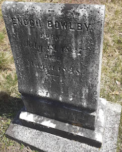 Parents Father: BOWLBY, Thomas Mother: GATES, Ann Birth Born on July 19, 1837 in Wilmot, Annapolis Co., NS Death Died on August 11, 1898 in Aylesford, Kings Co., NS Buried in Aylesford United Cemetery in Aylesford, Kings Co., NS Marriages ELLIOTT, Phoebe L. Married on April 14, 1856 in Cornwallis, Kings Co., NS Children BOWLBY, Orin Scott: February 13, 1871 - 1953 Notes Occupation: Farmer Sources Kings Cemetery Records: Aylesford United Cemetery Images Enoch Bowlby