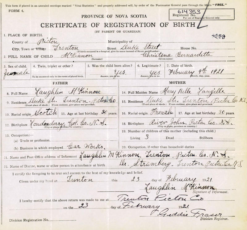 Parents Father: McKINNON, Laughlin Mother: LANGILLE, Mary Belle Birth Born on February 09, 1921 in Trenton, Pictou Co., NS Marriages MASON, Daniel Francis Married on June 30, 1945 in New Glasgow, Pictou Co., NS Images Bernadette McKinnon Birth Bernadette McKinnon Marriage