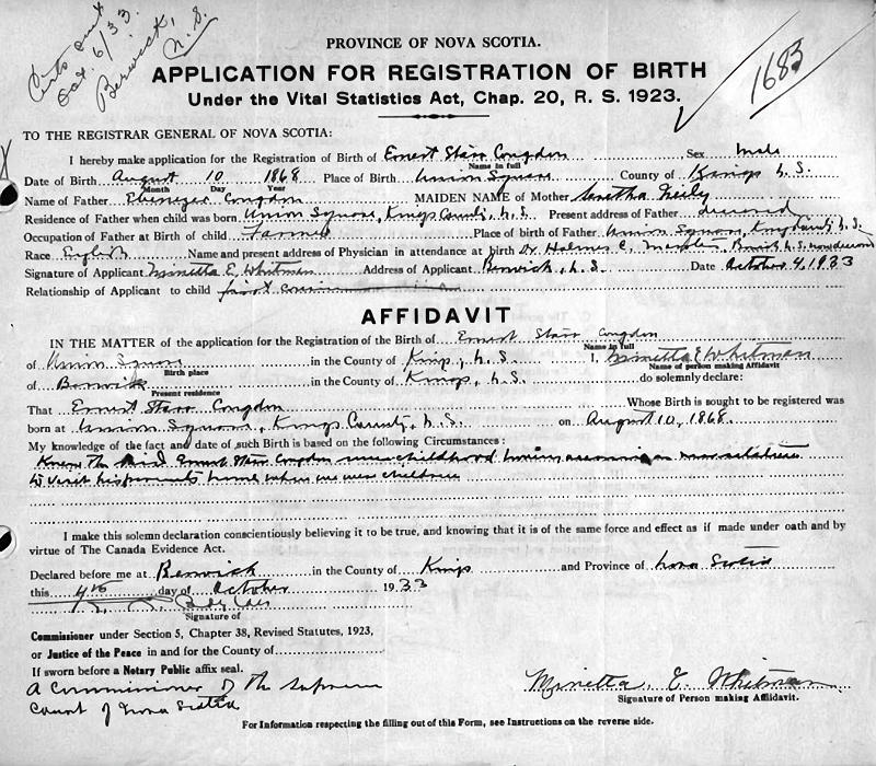 Birth Born on August 10, 1868 in Union Square, Kings Co., NS Death Died on November 03, 1938 in Winter Haven, Polk Co., FL Buried in Oaklawn Cemetery in Winter Haven, Polk Co., FL Marriages COGSWELL, Lillian A. Married on January 06, 1887 in Aylesford, Kings Co., NS Children CONGDON, Frank Roy: October 29, 1888 - January 30, 1960 Notes Occupation: Farmer Sources Florida Deaths: #19948 Images Ernest Congdon Birth Ernest Congdon Marriage