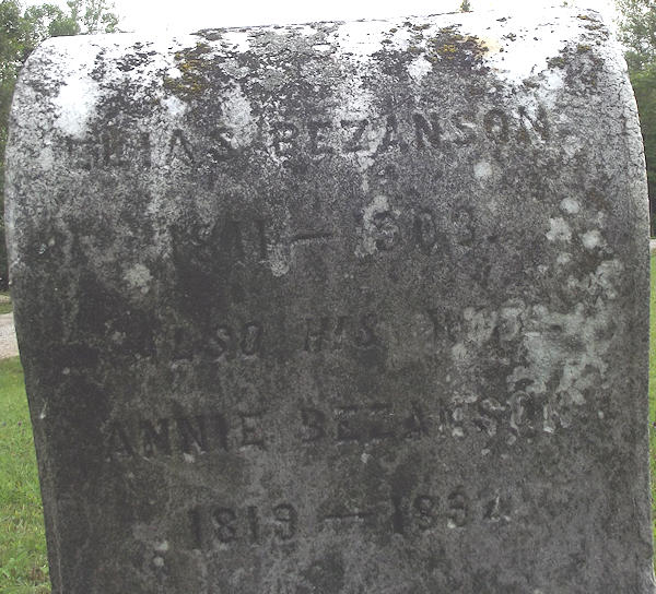 Birth Born on May 14, 1815 in Chester, Lunenburg Co., NS Death Died on February 13, 1903 in New Ross, Lunenburg Co., NS Buried in United Baptist Cemetery in New Ross, Lunenburg Co., NS Marriages HILTZ, Ann Elizabeth Married on November 07, 1839 in Chester, Lunenburg Co., NS Children BEZANSON, Benjamin: 1841 - July 10, 1915 BEZANSON, William: January 22, 1848 - November 27, 1935 Images Elias Bezanson Birth Elias & Ann (Hiltz) Bezanson Elias Bezanson Marriage