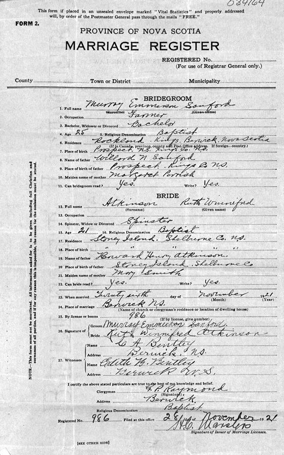 Parents Father: ATKINSON, Henry Howard Mother: SMITH, Mary Jane Birth Born on March 13, 1904 in Stoney Island, Shelburne Co., NS Death Died on 1984 in Rockland, Kings Co., NS Marriages SANFORD, Murray Emerson Married on November 26, 1921 in Berwick, Kings Co., NS Sources Mormons: https://www.familysearch.org/en/tree/person/details/LZDZ-K85 Images Ruth Atkinson Birth Murray Sanford Marriage