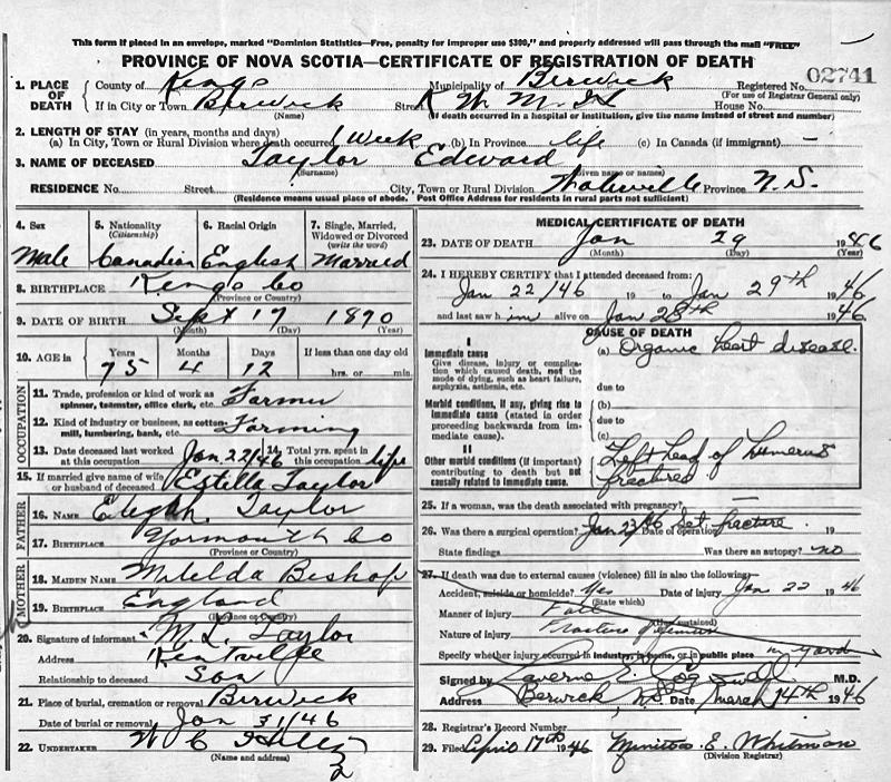 Birth Born on September 17, 1870 in Rockland, Kings Co., NS Death Died on January 29, 1946 in Berwick, Kings Co., NS Buried in Berwick Cemetery in Berwick, Kings Co., NS Marriages BROWN, Estella Blanche Married on November 07, 1900 in Kentville, Kings Co., NS OSBORNE, Mary D. Married on December 28, 1892 in Waterville, Kings Co., NS Children TAYLOR, Della Mary: November 22, 1898 - 1986 TAYLOR, Mabel Gertrude: 1907 - 1987 Notes Occupation: Farmer Death: Organic Heart Disease Sources Nova Scotia Deaths: Book 1946 Pg. 2741 Images Edward & Estella (Brown) Taylor Edward Taylor Death Edward Taylor Marriage Edward Taylor Marriage2