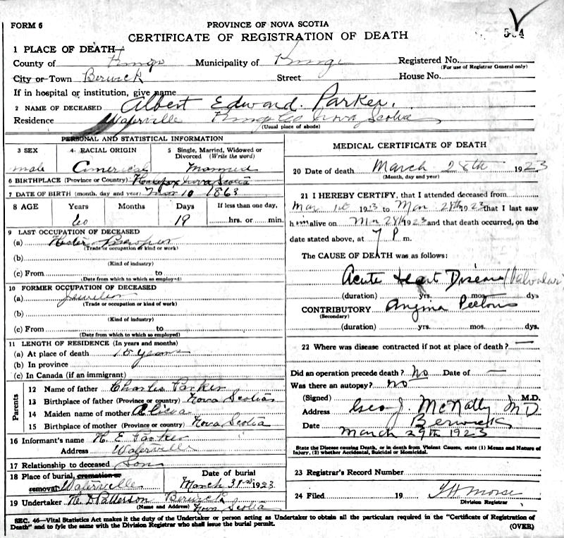 Birth Born on March 10, 1863 in Halifax, Halifax Regional Municipality, NS Death Died on March 28, 1923 in Berwick, Kings Co., NS Buried in Waterville Cemetery in Waterville, Kings Co., NS Marriages WALKER, Mabel Etta Married on October 15, 1883 in Halifax, Halifax Regional Municipality, NS Children PARKER, Rupert Freeman: December 14, 1903 - May 07, 1970 Notes Occupation: Clerk Death: Acute Heart Disease Sources Nova Scotia Deaths: Book 93 Pg. 504 Images Albert & Mabel (Walker) Parker Albert Parker Death Albert Parker Marriage
