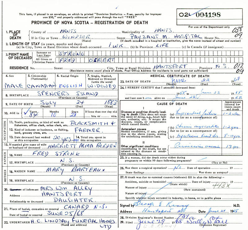 Birth Born on July 24, 1883 in Spencer's Island, Cumberland Co., NS Death Died on June 22, 1968 in Windsor, Hants Co., NS Buried in Jawbone Corner Cemetery in Canard, Kings Co., NS Marriages BORDEN, Harriet Alma Married on February 19, 1903 in Canard, Kings Co., NS Children STRONG, Hilda Maude: July 20, 1910 - July 10, 1935 Notes Occupation: Blacksmith - Farmer Death: Myocardial Failure Sources Nova Scotia Deaths: Year 1968 #4198 Images Fred Strong Death Fred Strong Marriage