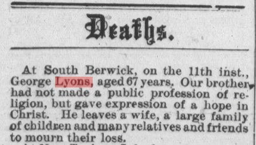 Birth Born on 1816 Death Died on July 11, 1883 in Berwick, Kings Co., NS Buried in Berwick Cemetery in Berwick, Kings Co., NS Marriages LAMONT, Rebecca Kinsman Married on 1857 in Billtown, Kings Co., NS Children LYONS, Fred Monson: December 05, 1875 - April 28, 1959 Sources Kings Cemetery Records: Berwick Cemetery Images George & Rebecca (Lamont) Lyons George Lyons Obit The Christian Messenger July 25,1883