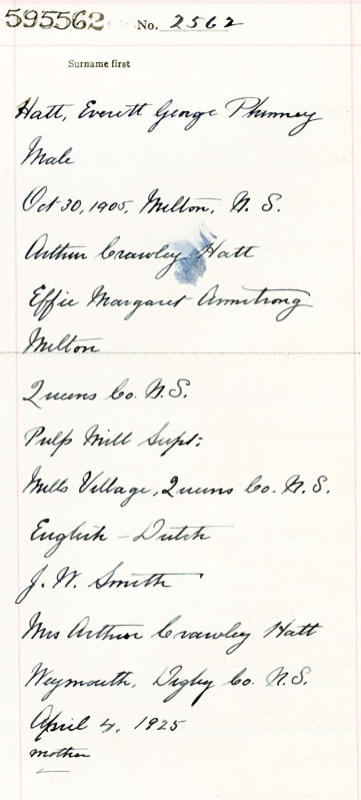 Parents Father: HATT, Arthur Crawley Mother: ARMSTRONG, Effie Flora Margaret Birth Born on October 30, 1905 in Milton, Queens Co., NS Death Died on November 26, 1976 in Nova Scotia, Canada Buried in Milton Cemetery in Milton, Queens Co., NS Marriages BRAKE, May Elizabeth Married on September 24, 1927 in Weymouth North, Digby Co., NS Children HATT, Labelle HATT, Geraldine Elizabeth: 1929 - September 02, 1987 HATT, Bruce W.: 1930 - 2019 HATT, Lillian Louise: 1933 - October 07, 2021 Notes Occupation: Clerk Images Everett Hatt Birth Everett & May (Brake) Hatt Everett Hatt Marriage