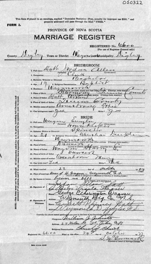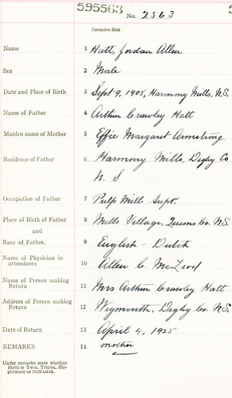 Parents Father: HATT, Arthur Crawley Mother: ARMSTRONG, Effie Flora Margaret Birth Born on September 09, 1908 in Harmony Mills, Queens Co., NS Death Died on April 19, 1972 in Digby, Digby Co., NS Buried in Weymouth Church of Christ Cemetery in Weymouth, Digby Co., NS Marriages WAGNER, Evelyn Ursula Married on October 22, 1927 in Weymouth, Digby Co., NS Children HATT, Stanley A. Notes Occupation: Clerk/ General Merchant Death: Coronary Thrombosis Sources Nova Scotia Deaths: Year 1972 #3235 Images Jordan Hatt Birth Jordan Hatt Death Jordan Hatt Marriage