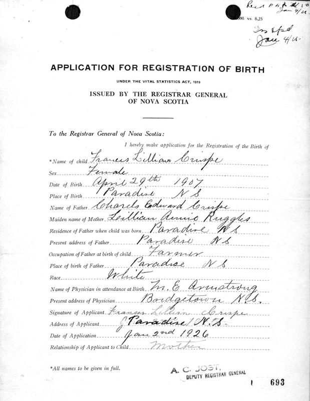 Parents Father: CRISPE, Charles Edward Mother: RUGGLES, Annie Lillian Birth Born on April 29, 1907 in Paradise, Annapolis Co., NS Images Frances Crispe Birth1 Frances Crispe Birth