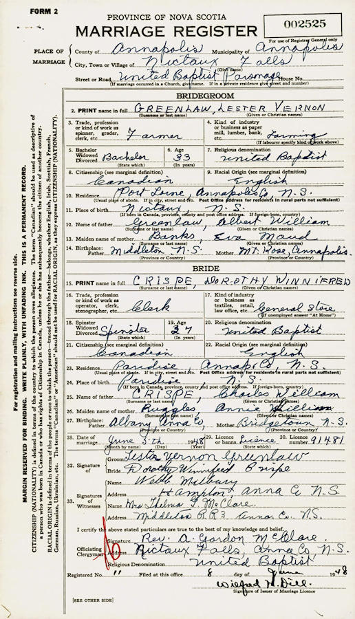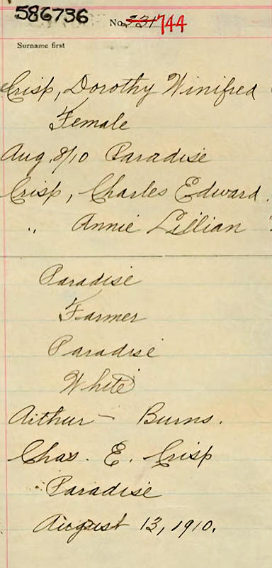 Parents Father: CRISPE, Charles Edward Mother: RUGGLES, Annie Lillian Birth Born on August 08, 1910 in Paradise, Annapolis Co., NS Images Dorothy Crisp Birth Lester & Dorothy (Crisp) Greenlaw Dorothy Crisp Marriage