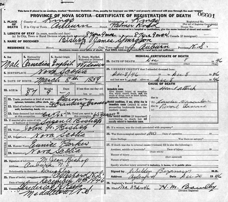 Birth Born on March 20, 1859 in Auburn, Kings Co., NS Death Died on December 08, 1946 in Auburn, Kings Co., NS Buried in Aylesford Union Cemetery in Aylesford, Kings Co., NS Marriages MARGESON, Susan Arabella Married on December 26, 1889 in Margaretsville, Annapolis Co., NS Children BISHOP, Fred Margeson: October 28, 1890 - February 03, 1979 BISHOP, Harold Fletcher: August 09, 1896 - April 26, 1919 BISHOP, Margaret Jean: February 24, 1898 - April 25, 1983 BISHOP, John Burtt: September 09, 1900 - 1966 Notes Occupation: Fruit Grower Death: Heart Attack Sources Nova Scotia Deaths: Book 1946 Pg. 6601 Images James Bishop Death