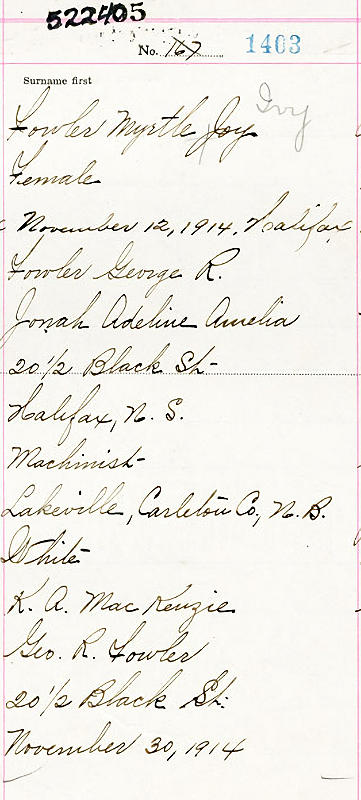 Parents Father: FOWLER, George Rulofson Mother: JONAH, Adeline Amelia Birth Born on November 12, 1914 in Amherst, Cumberland Co., NS Death Died on September 08, 2012 in California, USA Buried in Desert Lawn Memorial Park in Calimesa, Riverside Co., CA Marriages ERICKSON, Clarence Alfred Married on February 13, 1936 in Los Angeles Co., CA Children ERICKSON, Dennis Fowler: June 27, 1943 Notes Occupation: Employee United California Bank/ Claims Auditor Insurance Co. Obituary: OBITUARY Myrtle Erickson November 12, 1914 \endash September 8, 2012 in the care of Gates, Kingsley & Gates Praiswater Mortuary In loving Memory of Mrs. Erickson. Born on November 12, 1914 and Passed Away on September 08, 2012 Mrs. Erickson, a native of Halifax, Nova Scotia, attended L.A. City College. She was in banking, working with United California Bank and was also a claims auditor for an insurance company. Mrs. Erickson had one son, Rev. Dennis Fowler Erickson of Northridge, a grandson; Todd and a granddaughter; Monica and three great grandchildren. We will miss you. Canoga Park,Los angeles,CA May 19,2022 Sources Obituary: Canoga Park,Los angeles,CA May 19,2022 Images Myrtle Fowler Birth Clarence & Myrtle (Fowler) Erickson