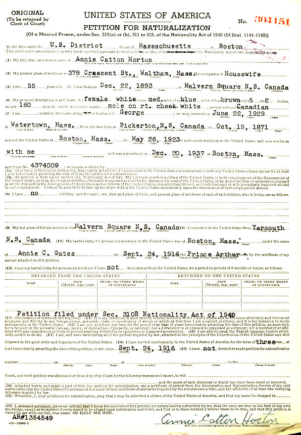 Parents Father: GATES, Nelson Mother: LELAND, Eleanor D'Arcy Birth Born on December 22, 1893 in Melvern Square, Annapolis Co., NS Death Died on 1964 in Massachusetts, USA Buried in Fairview Cemetary in Hyde Park, Norfolk Co., MA Marriages HORTON, George Milton Married on June 22, 1929 in Watertown, Middlesex Co., MA Sources Mormons: https://www.familysearch.org/tree/person/details/KCCX-RPF Images Annie (Gates) Horton Naturalization Annie Gates
