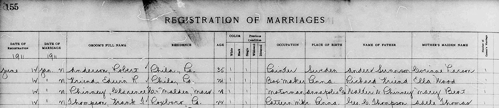 Parents Father: PHINNEY, Walter Willett Mother: BENT, Mary Norris Birth Born on December 30, 1881 in Wilmot, Annapolis Co., NS Death Died on 1945 in Melrose, Middlesex Co., MA Buried in Wyoming Cemetery in Melrose, Middlesex Co., MA Marriages McNEAR, Alice Winifred Married on January 21, 1911 in Wilmington, New Castle Co., DE Children PHINNEY, Velma L.: November 19, 1912 - March 07, 2003 PHINNEY, Donald L.: June 12, 1919 - July 28, 1984 PHINNEY, Kenneth Marshall: September 06, 1921 - February 17, 1979 Notes Occupation: Motorman Boston Elevated Railroad Sources Massachusetts Cemeteries: Wyoming Cemetery Melrose,MA Images Clarence C. Phinney WW2 Draft Clarence Phinney Marriage