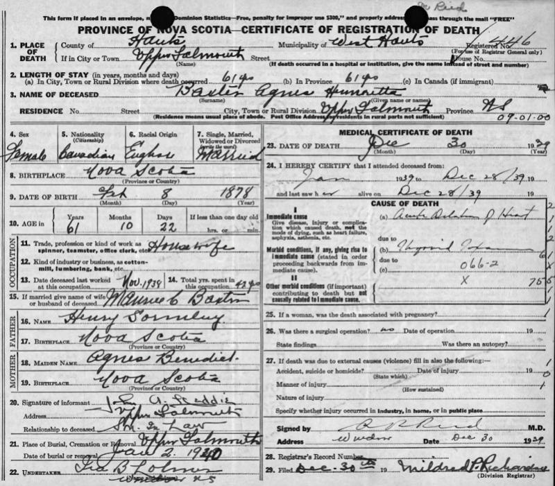 Birth Born on February 08, 1878 in Upper Falmouth, Hants Co., NS Death Died on December 30, 1939 in Upper Falmouth, Hants Co., NS Buried in St. George's Anglican Cemetery in Falmouth, Hants Co., NS Marriages BAXTER, Charles Maurice Married on October 02, 1906 in Upper Falmouth, Hants Co., NS Children BAXTER, Ruth Stinchfield: July 25, 1907 - 1986 Notes Death: Acute Dilation of Heart Sources Nova Scotia Deaths: Book 179 Pg. 446 Images Agnes (Gormley) Baxter Henrietta (Gormley) Baxter Death Charles Baxter Marriage