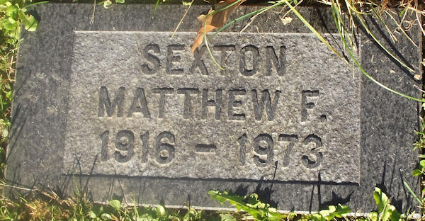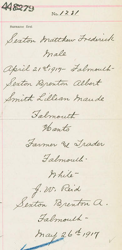 Parents Father: SEXTON, Brenton Albert Mother: SMITH, Lillian Maude Birth Born on April 21, 1917 in Falmouth, Hants Co., NS Death Died on June 09, 1973 in Falmouth, Hants Co., NS Buried in Falmouth Cemetery in Falmouth, Hants Co., NS Marriages SMITH, Miriam Irene Married on May 19, 1936 in Windsor, Hants Co., NS Divorced in 1954 Children SEXTON, Linda SEXTON, Lillian Joan: 1936 - January 26, 2010 Notes Occupation: Farmer Death: Suicide Gun Shot to Head Sources Nova Scotia Deaths: Year 1973 #3937 Images Matthew Sexton Birth Matthew Sexton Matthew Sexton Death Matthew Sexton Marriage