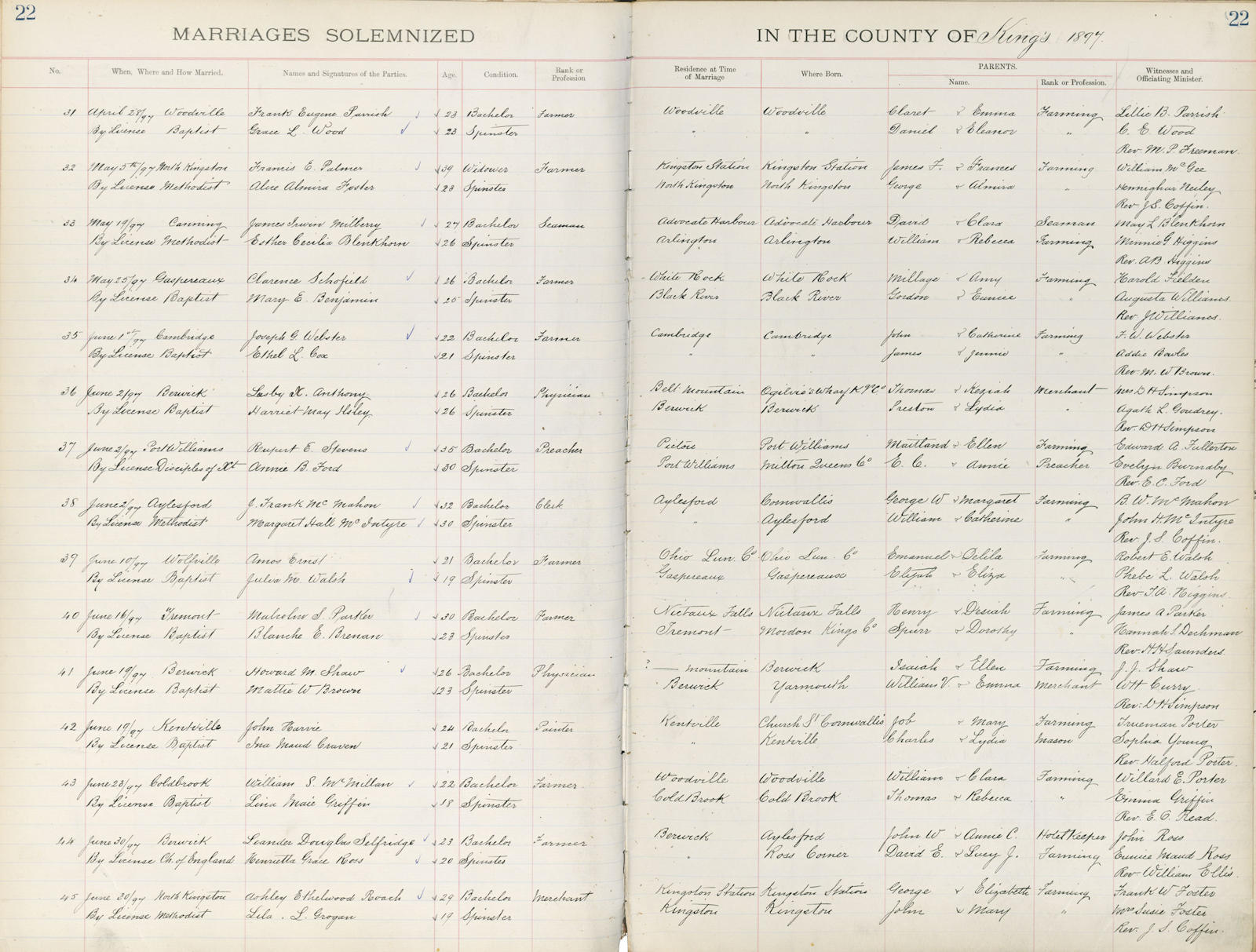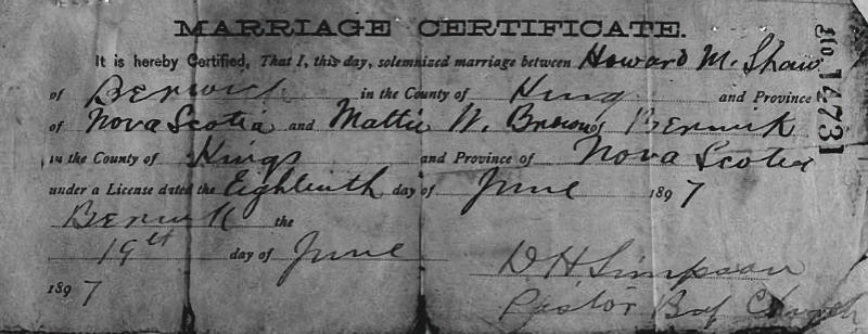 Parents Father: BROWN, William Valentine Mother: WYMAN, Emma Birth Born on February 11, 1874 in Arcadia, Yarmouth Co., NS Death Died on 1945 in Ashland, Jackson Co., OR Buried in Mountain View Cemetery in Ashland, Jackson Co., OR Marriages SHAW, Howard Messenger Married on June 19, 1897 in Berwick, Kings Co., NS Children SHAW, Victor Bayard: July 07, 1901 - May 27, 1929 SHAW, Marvin Brown: October 02, 1907 - June 02, 1972 Notes Occupation: Physician Historical Information: RS. MATTIE SHAW, M.D., C. M. From a very early era in the world's history the healing art has attracted to its practice some of the brightest masculine minds of every age, but only within a comparatively recent period has the profession been open to women. The advancement made by women and the change in public sentiment are nowhere more evident than in their present high standing in the science of therapeutics , as illustrated by the successful careers of many women physicians in different parts of the country. Within this class mention belongs to Dr. Mattie (Brown) Shaw, who is engaged in professional work at Ashland, and stands side by side with her husband, Dr. H. M. Shaw, in possessing a broad and thorough knowledge of medicine and skill in its practice. Miss Mattie Brown was born in Yarmouth, Nova Scotia, and was next to the youngest among seven children, six of whom are now living. Her father, W.V. Brown, was born in Nova Scotia, being the son of Charles Brown, a lifelong farmer of that peninsula, and he himself followed agricultural pursuits, but also gave some attention to the practice of the law. At this writing he holds office as queen's magistrate. The family of which he is a member traces its lineage to Scotch-Irish forefathers. His wife bore the maiden name of Emma Wyman and was born in Yarmouth, of English extraction. All of their children were given good educational advantages. At an early age their daughter, Mattie, displayed the possession of exceptional ability, and this they endeavoured to nourish and train by giving her the advantages of study in the Academy at Yarmouth, after which she graduated from Horton Collegiate Academy at Wolfville, Nova Scotia. At the age of seventeen she entered Dalhousie University and took the regular course in the medical department, from which she was graduated in 1897, with the degree of M.D., C.M. Meantime she had enlarged her professional knowledge through a year's study in Boston, Mass., three months of which were passed in Brookline hospital and nine months in the Maternity hospital in Boston. Immediately after graduating she was married, June 19, 1897, to Dr. H. M. Shaw, and they have one son, Victor Bayard, who was born July 3, 1901. In matters pertaining to the medical profession Dr. Mattie Shaw has ever shown the deepest interest. Besides her private practice she is examing physician for the following lodges at Ashland: Ladies Order Tents of the Maccabees, Royal Neighbors, the Order of Pendo and Women of Woodcraft. Since coming to Oregon she has been affiliated with the Southern Oregon Medical Society, in addition to which she is a member of the Dalhousie University Alumni Association." Portrait and biographical record of western Oregon, 1904, pp.627-8 Sources Cemetery: Mountain View Cemetery Ashland,OR Images Martha Brown Birth Howard & Martha (Brown) Shaw Howard Messenger Marriage Certificate Howard Shaw Marriage