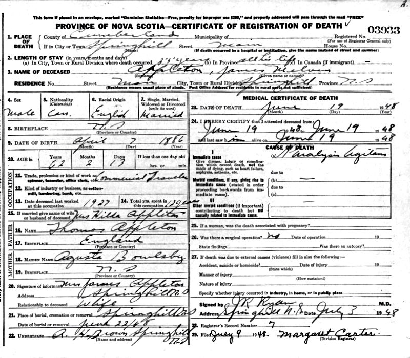 Parents Father: APPLETON, Thomas Mother: BOWLSBY, Augusta Birth Born on April 07, 1886 in Londonderry, Colchester Co., NS Death Died on June 19, 1948 in Springhill, Cumberland Co., NS Buried in Hillside Cemetery in Springhill, Cumberland Co., NS Marriages BROWN, Hilda Jean Married on September 18, 1912 in Springhill, Cumberland Co., NS Children APPLETON, Arnold Douglas: July 29, 1917 - March 04, 2009 APPLETON, Boy: July 13, 1924 - July 13, 1924 APPLETON, Arthur Brown: July 13, 1924 - July 08, 2013 Notes Occupation: Merchant/ Commercial Traveller Death: Paralysis Agitans Sources Nova Scotia Deaths: Book 1948 Pg. 3933 Images James Appleton Death James Appleton Marriage