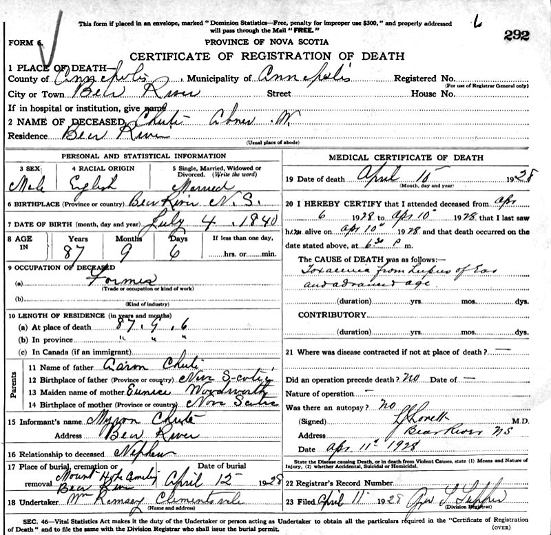 Parents Father: CHUTE, Aaron Mother: WOODWORTH, Eunice Birth Born on July 04, 1840 in Bear River, Annapolis Co., NS Death Died on April 10, 1928 in Bear River, Annapolis Co., NS Buried in Mount Hope Cemetery in Bear River, Annapolis Co., NS Marriages CHUTE, Delina Married on May 31, 1905 in Clementsport, Annapolis Co., NS Notes Occupation: Farmer Death: Toxemia From Lupus of Ear Sources Nova Scotia Deaths: Book 115 Pg. 292 Images Abner Chute Death Delina Chute Marriage3