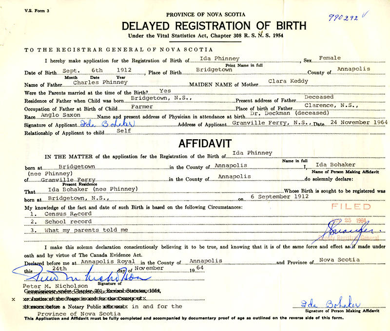 Parents Father: PHINNEY, Charles Tucker Mother: KEDDY, Clarissa Anne Birth Born on September 06, 1912 in Bridgetown, Annapolis Co., NS Death Died on January 19, 2004 in Bridgetown, Annapolis Co., NS Buried in Stoney Beach Cemetery in Granville Beach, Annapolis Co., NS Marriages BOHAKER, Lovett Maxwell Married on June 13, 1931 in Paradise, Annapolis Co., NS Children BOHAKER, Florence M.: February 07, 1932 BOHAKER, Ronald Allan: September 06, 1933 - May 17, 1944 BOHAKER, Brian Randall: August 10, 1950 - January 30, 2024 Notes Occupation: Store Clerk Obituary: BOHAKER, Ida - 91, Bridgetown, formerly of Granville Centre, passed away January 19, 2004, in Mountain Lea Lodge, Bridgetown. Born in Bridgetown, Annapolis Co., she was a daughter of the late Charles and Clara (Keddy) Phinney. Ida was a member of Granville Beach Baptist Church for many years. She enjoyed gardening, quilting and knitting. She is survived by son, Brian (Cheryl) Bohaker, Granville Centre; daughter, Florence (James) Godino, Hobe Sound, Fla.; seven grandchildren; two step grandchildren; several nieces and nephews. She was predeceased by her husband, Lovett; son, Ronald Bohaker; sisters, Laura Ells, Rita Hill, Rena Phinney; brother, Lawrence Phinney. There will be visitation 3-7 p.m. Wednesday, January 21 and funeral service 11 a.m. Thursday, January 22, both in Robert L. Hall Funeral Home, Annapolis Royal, Rev. Elizabeth Waugh officiating. Cremation will follow the funeral service. Burial will be in Stoney Beach Cemetery, Granville Centre at 11 a.m. Saturday, January 24. Family flowers only. Donations in Ida's memory may be made to Mountain Lea Lodge or a charity of your choice. Halifax herald Halifax,NS January 20,2004 Sources Halifax Herald: Obituary January 20,2004 Images Ida Phinney Birth Lovett & Ida (Phinney) & Ronald Bohaker Ida Phinney Marriage