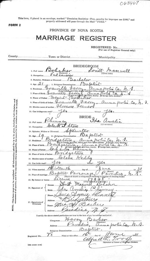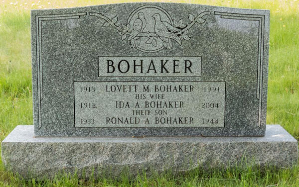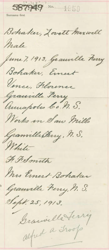 Parents Father: BOHAKER, Ernest Walter Mother: FEENER, Florence May Birth Born on June 07, 1913 in Granville Ferry, Annapolis Co., NS Death Died on August 23, 1991 in Annapolis Royal, Annapolis Co., NS Buried in Stoney Beach Cemetery in Granville Beach, Annapolis Co., NS Marriages PHINNEY, Ida Amelia Married on June 13, 1931 in Paradise, Annapolis Co., NS Children BOHAKER, Florence M.: February 07, 1932 BOHAKER, Ronald Allan: September 06, 1933 - May 17, 1944 BOHAKER, Brian Randall: August 10, 1950 - January 30, 2024 Notes Occupation: Vulcanizer Obituary: BOHAKER, Lovett Maxwell \endash 78, of Granville Centre, died Friday, August 23, 1991 in Annapolis General Hospital. Born in 1913 at Granville Beach, he was a son of the late Ernest Walter Bohaker (1877-1971) and Florence May (Feener) Bohaker (1884-1934). He was a member of Granville Centre Baptist Church. He is survived by his wife, Ida Amelia (Phinney) Bohaker, whom he married in 1931; a son, Brian Bohaker, of Bedford; a daughter, Florence (Jim) Godino, of West Palm Beach, Florida; five sisters, Helen Beatrice (Bohaker) Chisholm, of Karsdale; Goldie Pearl (Bohaker) Rule, of Florida; Doris (Bohaker) Wood, of Victoria, British Columbia; Martha Marie (Bohaker) Anair; Mary Dorothy (Bohaker) Gregory; two half-sisters, Edith and Joan; seven grandchildren; six great-grandchildren. He was predeceased by a son, Ronald Allan Bohaker (1933-1944); two sisters, Violet Alberta Bohaker (1907-1920); and Evangeline Ethel (Bohaker) Joley (1911-1989); a brother, Robert Oland Bohaker (1917-1989). The body is in Robert L. Hall Funeral Home, Annapolis Royal, where the funeral will be held at 2 pm today, with Rev. Robert Matthews and Rev. Deanne Dugas officiating. Cremation will follow. Donations to Granville Beach or Granville Centre Baptist Church would be appreciated. Sources Newspaper Obituary: Annapolis Spectator Annapolis Royal,NS August 1991 Images Lovett Bohaker Birth Lovett & Ida (Phinney) & Ronald Bohaker Ida Phinney Marriage
