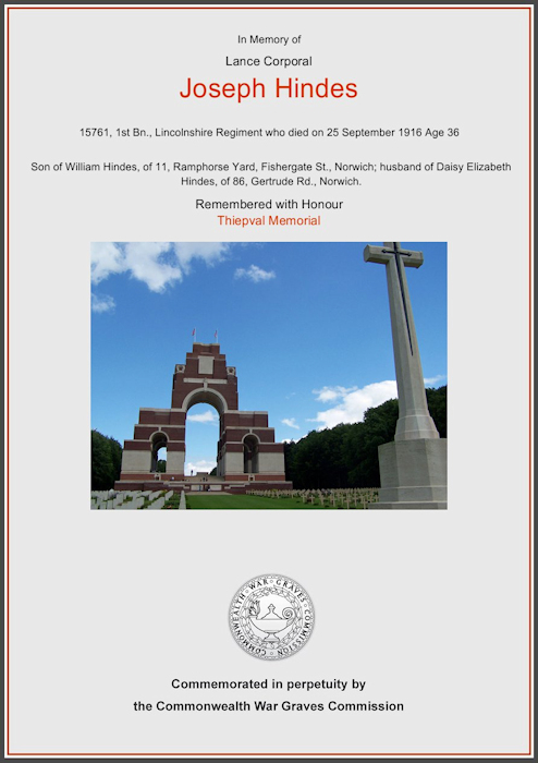 Birth Born on 1879 in Norwich, Norfolk, England Death Died on September 25, 1916 in Somme, France Marriages SPURRELL, Daisy Elizabeth Married on 1900 in Norwich, Norfolk, England Children HINDES, Joseph Thomas: August 02, 1903 - May 30, 1979 Notes Military Service: WW1 Royal Army 1st Battalion Lincolnshire Regiment Images Joseph Hindes WW2 Memorial