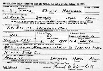 Parents Father: MARSHALL, James Alfred Mother: STEEVES, Annie Eleanor Birth Born on June 21, 1878 in Gowland Mountain, Albert Co., NB Death Died on May 02, 1957 in Massachusetts, USA Buried in Puritan Lawn Memorial Park in Peabody, Essex Co., MA Marriages MARSHALL, Ella May Married on June 25, 1905 in Lynn, Essex Co., MA Notes Occupation: Foreman - Shoe Factory Sources Findagrave.com: http://www.findagrave.com/cgi-bin/fg.cgi?page=gr&GRid=126286797 Images Frank E. Marshall WW2 Draft Frank E. Marshall Marriage