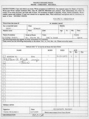 Birth Born on July 05, 1828 in Hopewell, Albert Co., NB Death Died in Owl's Head, Knox Co., ME Buried in Holiday Beach Cemetery in Owl's Head, Knox Co., ME Marriages ROGERS, Ellen Ann Children PECK, Maria E.: 1853 PECK, Lucy A.: August 02, 1855 PECK, Ida Ann: May 23, 1858 - October 22, 1943 PECK, Herman: 1861 PECK, Ausina R.: 1863 - August 10, 1875 Notes Occupation: Carpenter Images Edward Peck 1860 Wisconsin Census Edward Peck Maine Cemetery Index