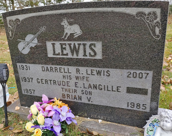 Parents Father: LANGILLE, Victor Ernest Mother: MILLETT, Leta Frances Birth Born on 1937 in Tatamagouche, Colchester Co., NS Death Buried in Sunny Brae Cemetery in Oliver, Colchester Co., NS Marriages LEWIS, Darrell Raymond Children LEWIS, Sylvia LEWIS, Elizabeth LEWIS, Ethel LEWIS, Derek LEWIS, Nicole LEWIS, Raymond: September 12, 1955 - November 09, 2023 LEWIS, Brian Victor: 1957 - May 22, 1985 Images Darrell & Gertrude (Langille) & Brian Lewis