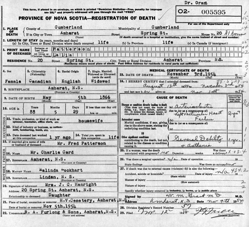 Birth Born on May 05, 1866 in Amherst, Cumberland Co., NS Death Died on November 03, 1954 in Amherst, Cumberland Co., NS Buried in Highland View Cemetery in Amherst, Cumberland Co., NS Marriages PATTERSON, Frederick Married on June 09, 1883 in Amherst, Cumberland Co., NS Children PATTERSON, Herbert Allan: January 17, 1886 - April 18, 1969 Notes Death: Heart Failure Sources Nova Scotia Deaths: Book 1954 Pg. 5595 Images Lalia (Card) Patterson Death Frederick Patterson Marriage