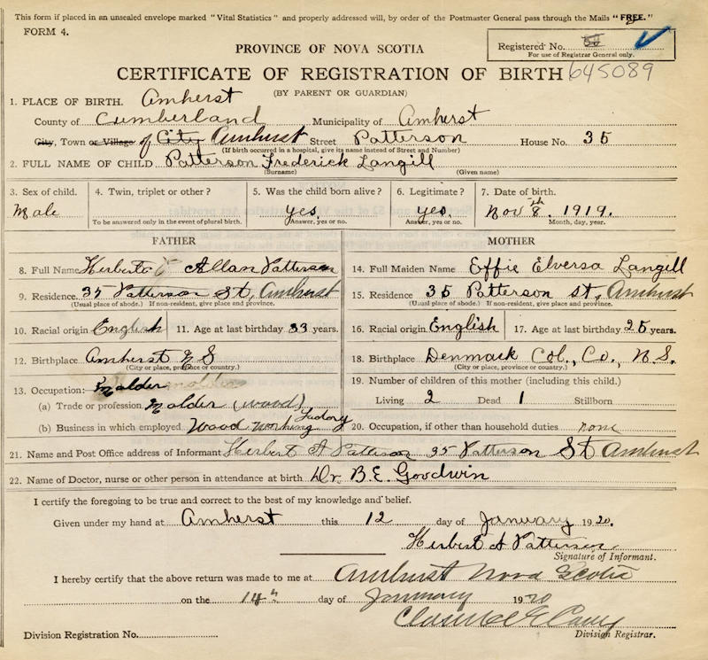 Parents Father: PATTERSON, Herbert Allan Mother: LANGILLE, Effie Elversa Birth Born on November 08, 1919 in Amherst, Cumberland Co., NS Death Died on November 27, 2010 in Amherst, Cumberland Co., NS Marriages ADAMS, Mae Thressa Married on June 26, 1943 in Amherst, Cumberland Co., NS Children PATTERSON, Frederick PATTERSON, Sandra PATTERSON, Lannie PATTERSON, Effie PATTERSON, Kevin Notes Obituary: Frederick Langille Patterson November 8, 1919 - November 27, 2010 The death of Frederick L. Patterson, age 91, occurred on Saturday November 27, 2010 at Gables Lodge, Amherst, Nova Scotia. Born in Amherst, he was a son of the late Effie (Langille) and Herbert Patterson. Fred was predeceased by his wife, Mae (Adams), son, Frederick (Ricky) Patterson, and sister Elda Patterson. He is survived by his children, Sandra (Doug), Lannie (Pam), Effie (Steve) and Kevin (Vanessa); as well as several grandchildren, great grandchildren and great, great grandchild. Cremation has taken place under the care of Campbell's Funeral Home, Amherst NS 29-November-2010 Occupation: Automobile Mechanic Sources Newspaper Obituary: Obituary November 29, 2010 Images Frederick Patterson Birth Frederick Patterson Marriage