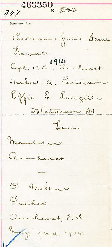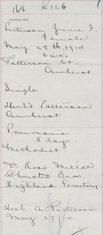 Parents Father: PATTERSON, Herbert Allan Mother: LANGILLE, Effie Elversa Birth Born on April 13, 1914 in Amherst, Cumberland Co., NS Death Died on May 27, 1914 in Amherst, Cumberland Co., NS Buried in Highland View Cemetery in Amherst, Cumberland Co., NS Notes Death: Pneumonia Sources Nova Scotia Deaths: Book 41 Pg. 42 #168 Images Jennie Patterson Birth Jennie Patterson Death Frederick Patterson Marriage