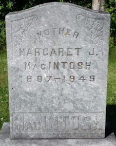 Birth Born on November 14, 1867 in Truro, Colchester Co., NS Death Died on September 10, 1949 in Truro, Colchester Co., NS Buried in Bayview Cemetery in Waldegrave, Colchester Co., NS Marriages MACINTOSH, John Married on September 13, 1887 in Central New Annan, Colchester Co., NS Children MACINTOSH, Glenn Roy: March 12, 1892 Notes Death: Hemiplegia Sources Nova Scotia Deaths: Book 1949 Pg. 5176 Colchester Cemeteries: Waldegrave Cemetery #10 Images Margaret (Glenn) MacIntosh