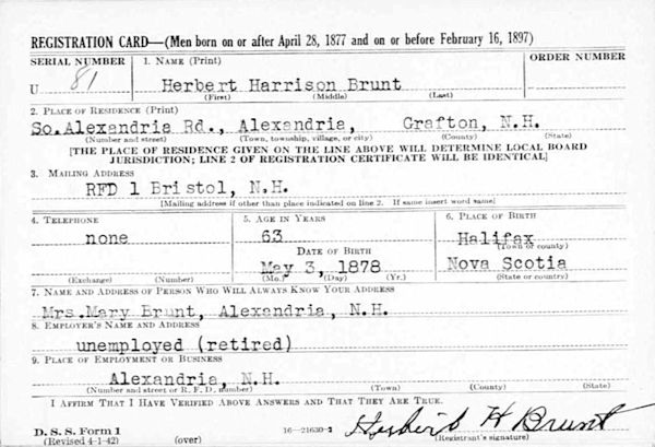 Parents Father: BRUNT, Robert David Mother: HARRISON, Annie Ross Birth Born on May 03, 1878 in Halifax, Halifax Regional Municipality, NS Death Died on April 08, 1953 in Franklin, Merrimack Co., NH Buried in St. Patrick Cemetery in Stoneham, Middlesex Co., MA Marriages , Mary C. Notes Occupation: Clerk/ Stationary Engineer/ Merchant Death: Cerebral Accident Sources New Hampshire Deaths: #531896 Images Herbert Brunt Death Herbert Brunt Draft WW1 Herbert Brunt Draft WW2 Herbert Brunt WW1 Draft Herbert Brunt WW2 Draft