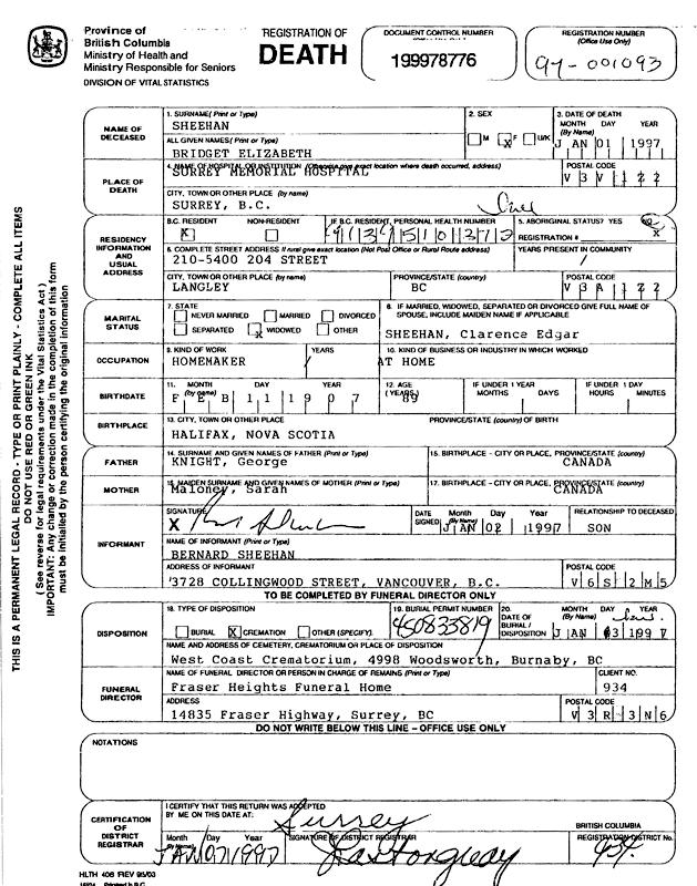 Parents Father: KNIGHT, George Joseph Mother: MALONEY, Sarah Catherine Birth Born on February 13, 1907 in Halifax, Halifax Regional Municipality, NS Death Died on January 01, 1997 in Surrey, Metro Vancouver Region, BC Buried in Valley View Memorial Gardens in Surrey, Metro Vancouver Region, BC Marriages SHEEHAN, Clarence Edgar Married on October 02, 1934 in Halifax, Halifax Regional Municipality, NS Children SHEEHAN, Bernard Notes Occupation: Book Binder Death: Myocardial Infarction Sources BC Deaths: #97-001093 Images Elizabeth Knight Birth Clarence & Elizabeth (Knight) Sheehan Elizabeth (Knight) Sheehan Elizabeth (Knight) Sheehan Death1 Elizabeth (Knight) Sheehan Death Clarence Sheehan Marriage
