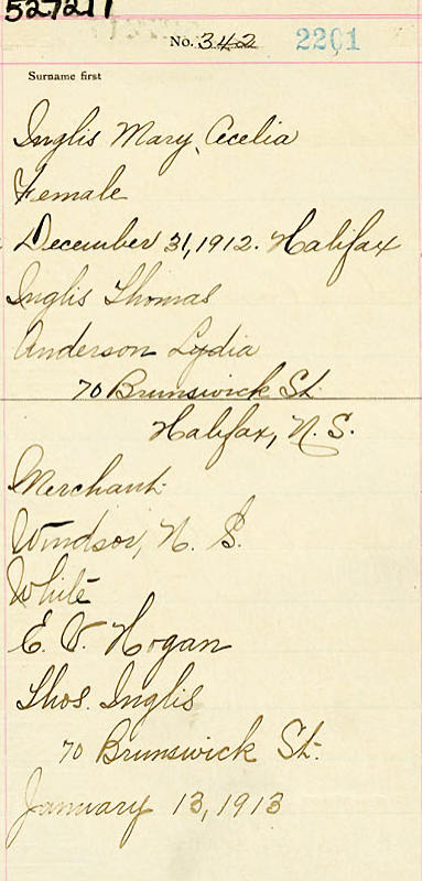 Parents Father: INGLIS, Thomas Joseph Mother: ANDERSON, Lydia Margaret Birth Born on December 31, 1912 in Halifax, Halifax Regional Municipality, NS Death Died on April 15, 1990 in Halifax, Halifax Regional Municipality, NS Buried in Gate Of Heaven Cemetery in Lower Sackville, Halifax Co., NS Marriages SHEEHAN, Walter Alfred Married on October 27, 1942 in Halifax, Halifax Regional Municipality, NS Notes Occupation: Stenographer Images Mary Inglis Birth Walter & Mary (Inglis) Sheehan Walter Sheehan Marriage