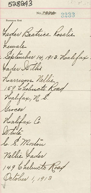 Parents Father: FADER, William Gould Mother: HARRISON, Elizabeth Mae Birth Born on September 14, 1913 in Halifax, Halifax Regional Municipality, NS Death Died on August 11, 1998 in Halifax, Halifax Regional Municipality, NS Buried in Fairview Lawn Cemetery in Halifax, Halifax Regional Municipality, NS Marriages LEGG, Victor Harry Married on September 06, 1937 in Armdale, Halifax, Halifax Co., NS Children LEGG, Robert Notes Occupation: Stenographer Obituary: 84, The Berkley, Halifax, died peacefully on August 11, 1998, in Camp Hill Veterans' Memorial Building, QEII. Born in Halifax, she was the beloved wife of the late Victor Legg and daughter of the late Willis and Elizabeth Fader. She was predeceased by brothers, Jack, Gordon; sister, Millie (Elliott); two brothers in infancy. In her earlier married years, Beatrice was a Sunday school teacher and Explorer leader at Oxford Street United Church. She was a member of Bethany United Church, a longtime member of Chester Golf Club and founding member of the Sunset Bowling League. She is survived by son, Robert and wife Lynne; granddaughters, Kimberley Jane, Halifax; Stephanie Lynne, Amherst. Sources Obituary: Halifax August 1998 Images Beatrice Fader Birth Victor & Beatrice (Fader) Legg