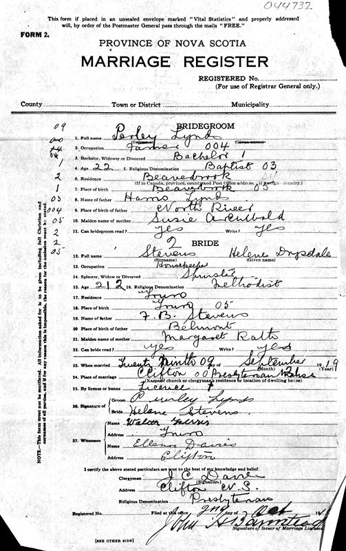 Birth Born on July 16, 1897 in Beaver Brook, Colchester Co., NS Death Died on May 06, 1980 in Truro, Colchester Co., NS Buried in Old Barns Cemetery in Old Barns, Colchester Co., NS Marriages STEVENS, Helene Drysdale Married on September 29, 1919 in Clifton, Colchester Co., NS Children LYNDS, Murray Carl: May 25, 1923 - August 26, 1974 Notes Occupation: Railway Section Foreman Military Service: Royal Canadian Army 85th Battalion WW1 Sources Jane Wile Database: I27206 Colchester Cemeteries: Clifton United Church Cemetery #32 Images Perley Lynds Birth Perley & Helene (Stevens) Lynds Perley Lynds Marriage