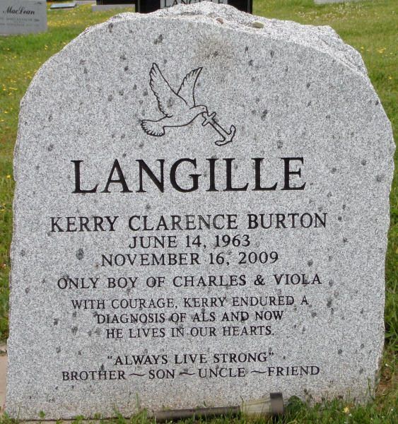 Parents Father: LANGILLE, Charles Burton Mother: MADORE, Viola Mae Birth Born on June 14, 1963 in Pictou, Pictou Co., NS Death Died on November 16, 2009 in Pictou Co., NS Buried in Seaview Cemetery in Pictou, Pictou Co., NS Notes Death: ALS Disease - Died on way home from hospital. Occupation: Labourer Sources Truro Daily News: Obituary November 18, 2009 Images Kerry Langille Kerry Langille Obit