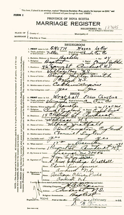 Parents Father: WRATHALL, Wilfred Mother: McKIM, Fannie Birth Born on January 04, 1926 in Wallace, Cumberland Co., NS Marriages SMITH, Hazen LeRoy Married on December 17, 1943 in Amherst, Cumberland Co., NS Children SMITH, Brenda Joyce: July 15, 1944 Notes Occupation: Stenographer Images Hazen Smith Marriage