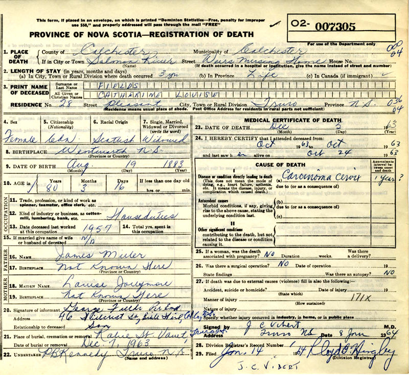 Birth Born on August 19, 1883 in Wentworth, Cumberland Co., NS Death Died on December 05, 1963 in Salmon River, Colchester Co., NS Buried in Robie St. Cemetery in Truro, Colchester Co., NS Marriages FIELDS, Henry Milton Married on September 19, 1906 in Wentworth, Cumberland Co., NS Children FIELDS, George Sinclair: August 26, 1907 - 1983 FIELDS, Eva May: November 15, 1920 - September 06, 2007 Notes Death: Carcinoma of Cervix Sources Nova Scotia Deaths: Year 1963 Pg. 7305 Images Catherine (Miller) Fields Death Henry Miller Marriage