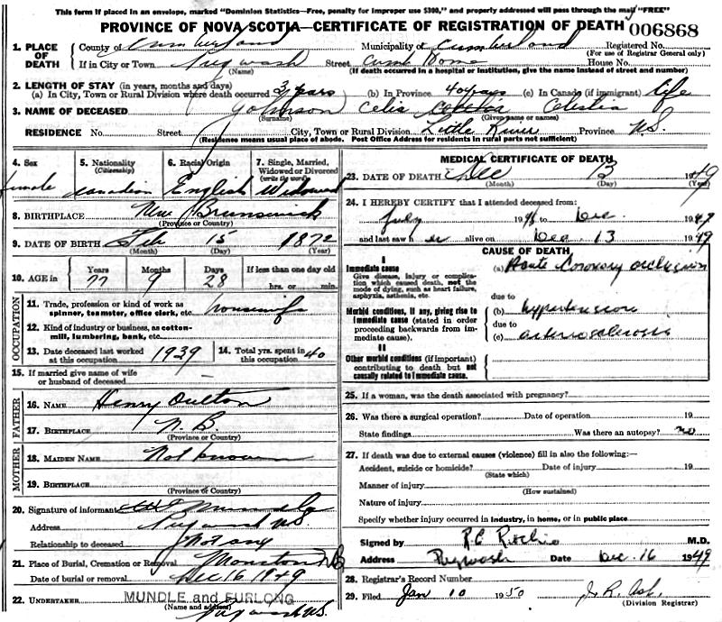 Birth Born on February 15, 1872 in Westmorland Co., NB Death Died on December 13, 1949 in Pugwash, Cumberland Co., NS Buried in Moncton, Westmorland Co., NB Marriages ADSHADE, Freeman Daniel Married on July 10, 1895 in Westmorland Co., NB Children ADSHADE, Della May: October 10, 1904 - June 17, 1977 Notes Death: Acute Coronary Occlusion Sources Nova Scotia Deaths: Year 1949 Pg. 6868 Images Celia Oulton Death Freeman Adshade Marriage Celia Oulton
